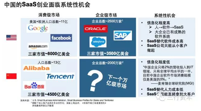 总而言之,在中国SaaS创业中,你会更容易的接触客户——最高级的、中等的、入门的,并且移动终端会带来快速推广的机会,同时去IOE化带来直接替代国际巨头的机会,最后在垂直领域又有机会。