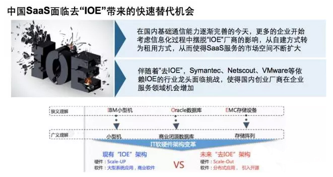 在中国的企业基础软件板块里,因为去“IOE”为中国SaaS带来了很好的机会。不仅底层的IOE在发生巨变,同时和IOE紧密相连的Symantec、Netscout、VMware等公司也在慢慢失去市场,这给国内创业企业在基础运维软件、安全领域等领域创造了大机会。 我们去国家开发银行、中国银行等机构实际调研时就会发现,他们想找很多基础领域里面的中国公司,比如日志管理等,但一是数量寥寥,二是实施案例都很少,因为他们还需要考虑如何给这些初创公司开绿灯来提高国产软件的使用率。如果想在基础软件里有所作为,这个机会一定要抓住。